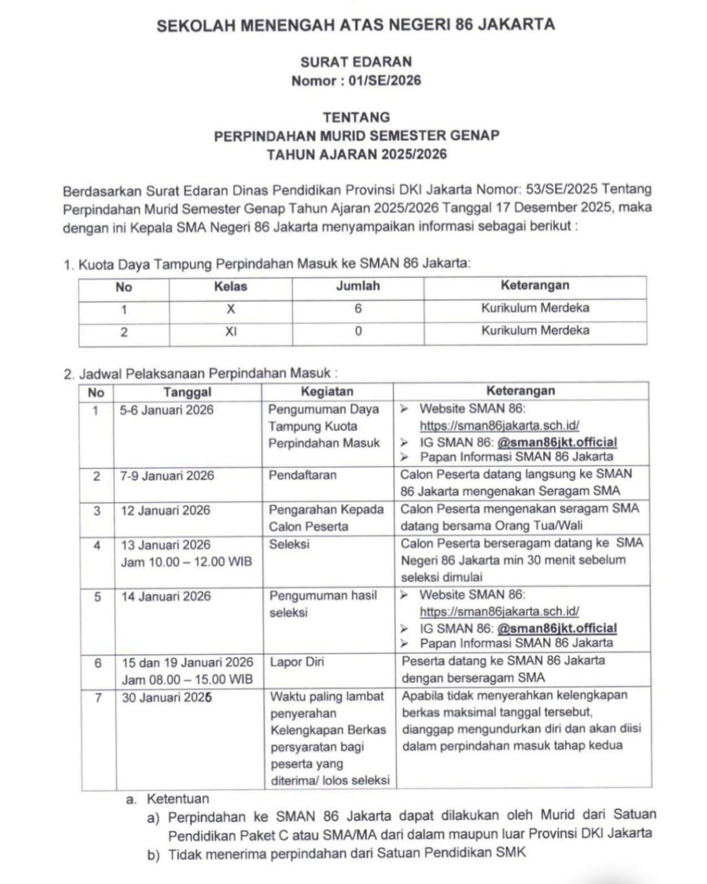 Berdasarkan Surat Edaran Dinas Pendidikan DKI Jakarta nomor 53/SE/2025 tentang Perpindahan Murid Semester Genap Tahun Ajaran 2025/2026 tanggal 17 Desember 2025, maka SMAN 86 Jakarta dengan ini menyampaikan informasi tentang FORMASI seleksi perpindahan (mutasi) murid semester genap tahun pelajaran 2025/2026.