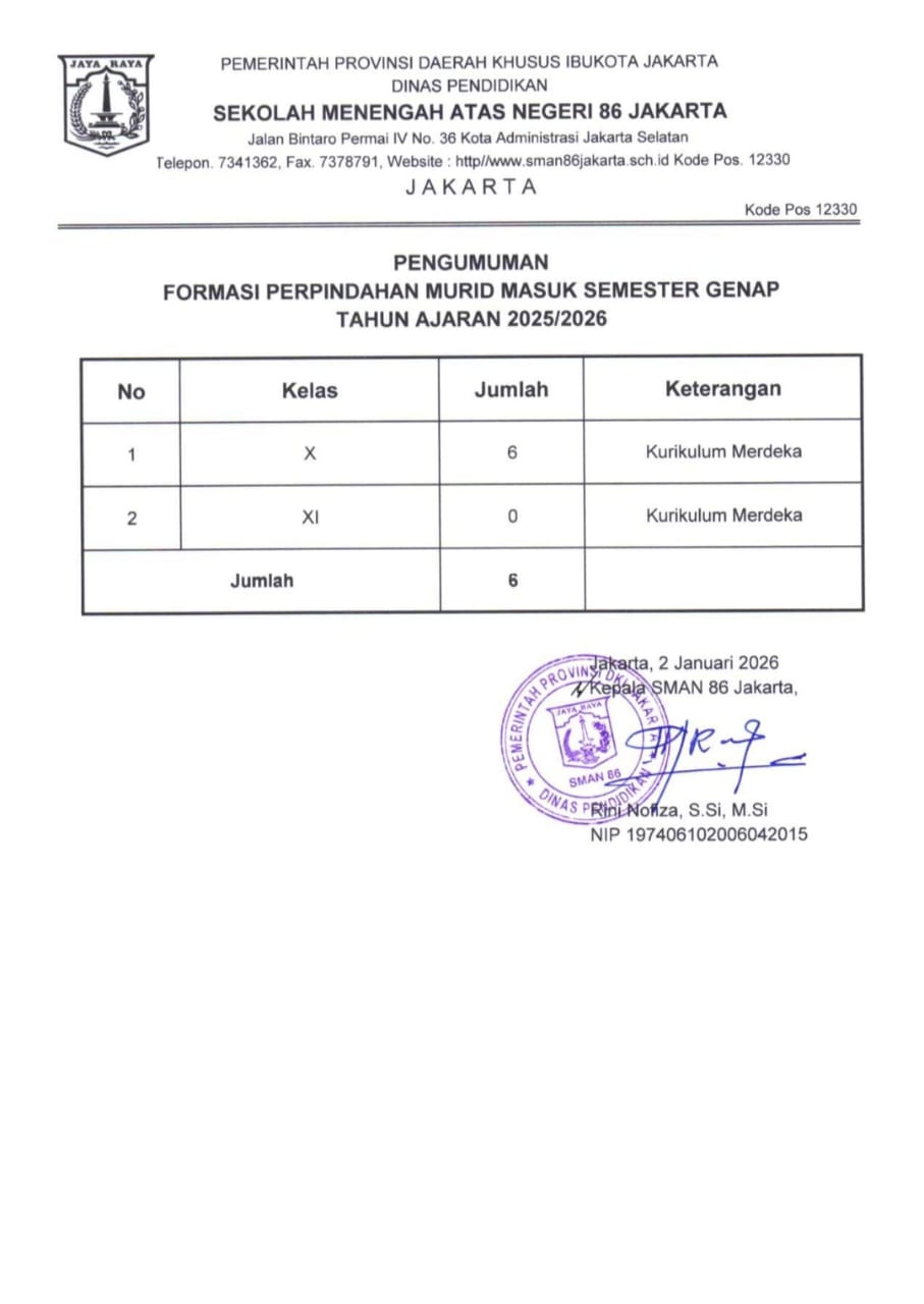 PENGUMUMAN FORMASI MUTASI SMAN 86 JAKARTA SEMESTER GENAP TA 2025/2026